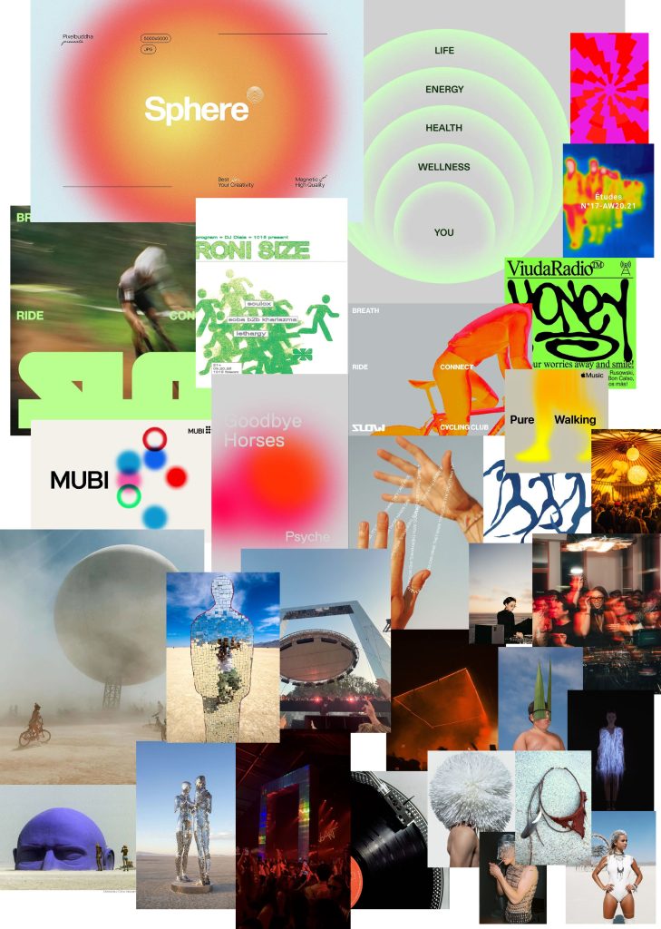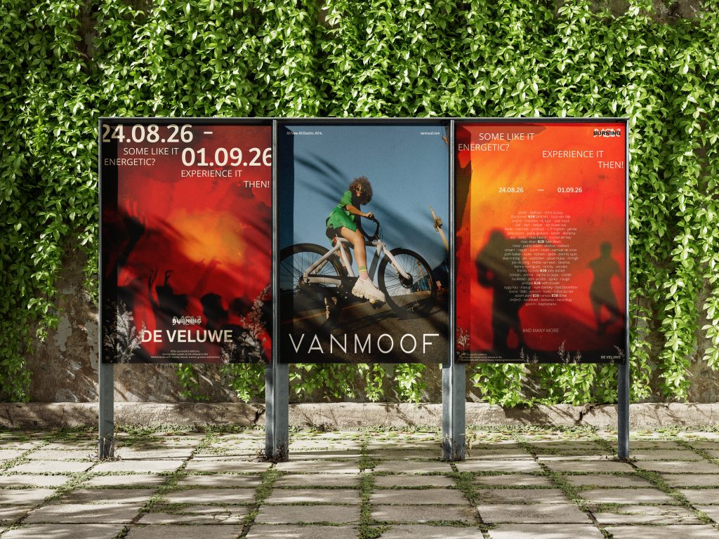 Het Burning Man-festival: voor dit festivalproject kwam het concept naar Nederland en moest het een eigen identiteit krijgen. Voor de opdracht hebben we geëxperimenteerd met analoge materialen en deze vertaald naar twee abri’s, een landingspagina, twee social posts en stickers.